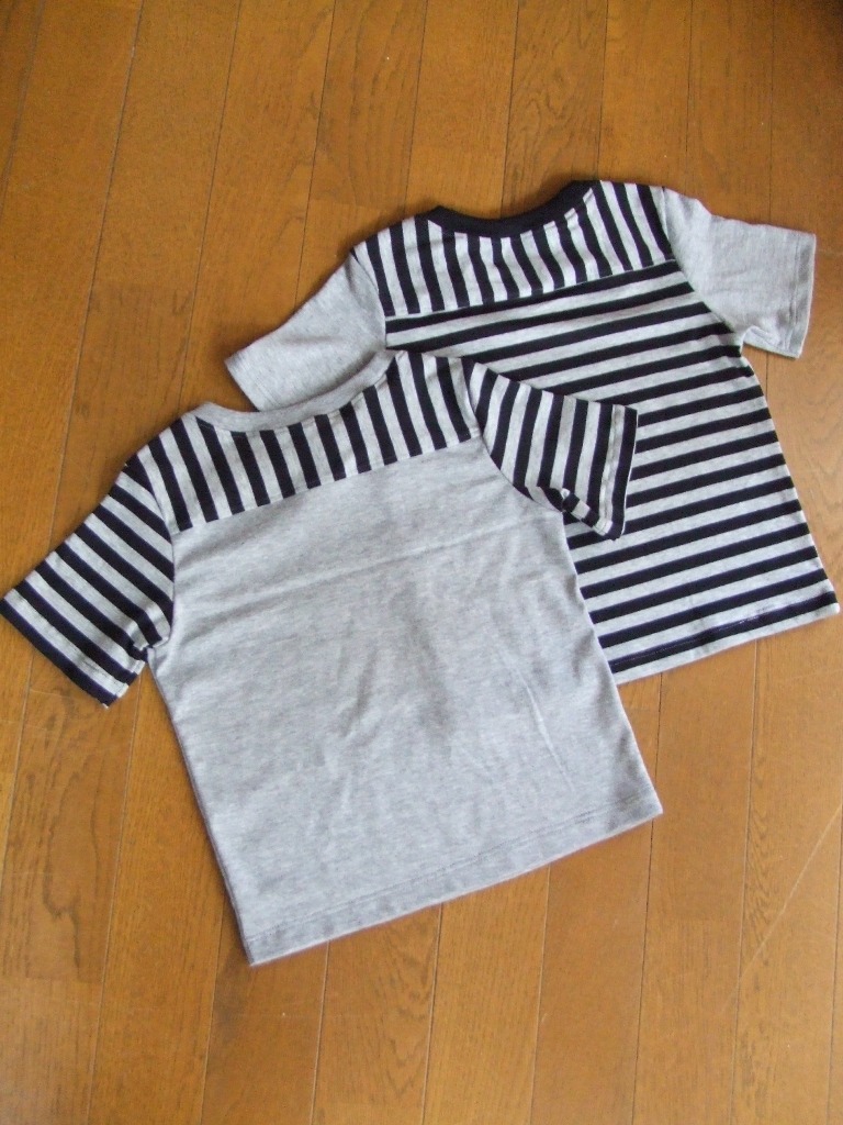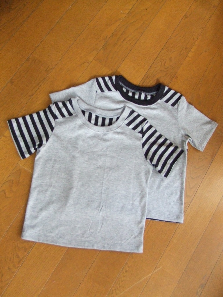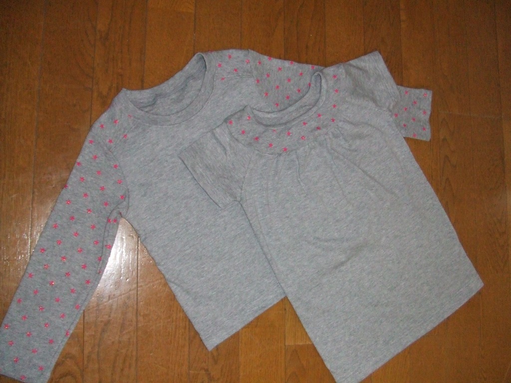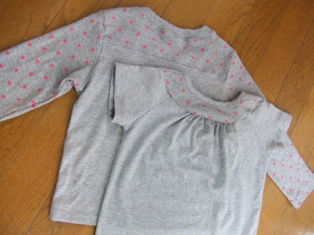 sanの大好きな☆柄で 長袖ショルダーヨークTシャツと半袖ヨークTシャツ 半袖の方は、前後ともギャザーが入っているので女の子らしくてかわいい感じ。 友達や近所のママ友からも、kouの出産祝いを色々いただいたので 内祝いと一緒に渡すために作りました。 七分袖のパジャマ。 長袖Tシャツ 半袖Tシャツ これは、sanとお揃いの☆柄で長袖Tシャツ 一枚は甥っ子へ。 もう一枚は同じ保育所に通う男の子へプレゼント。 お揃い大好きのsanは大喜びでした。