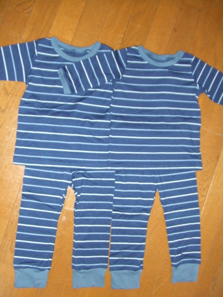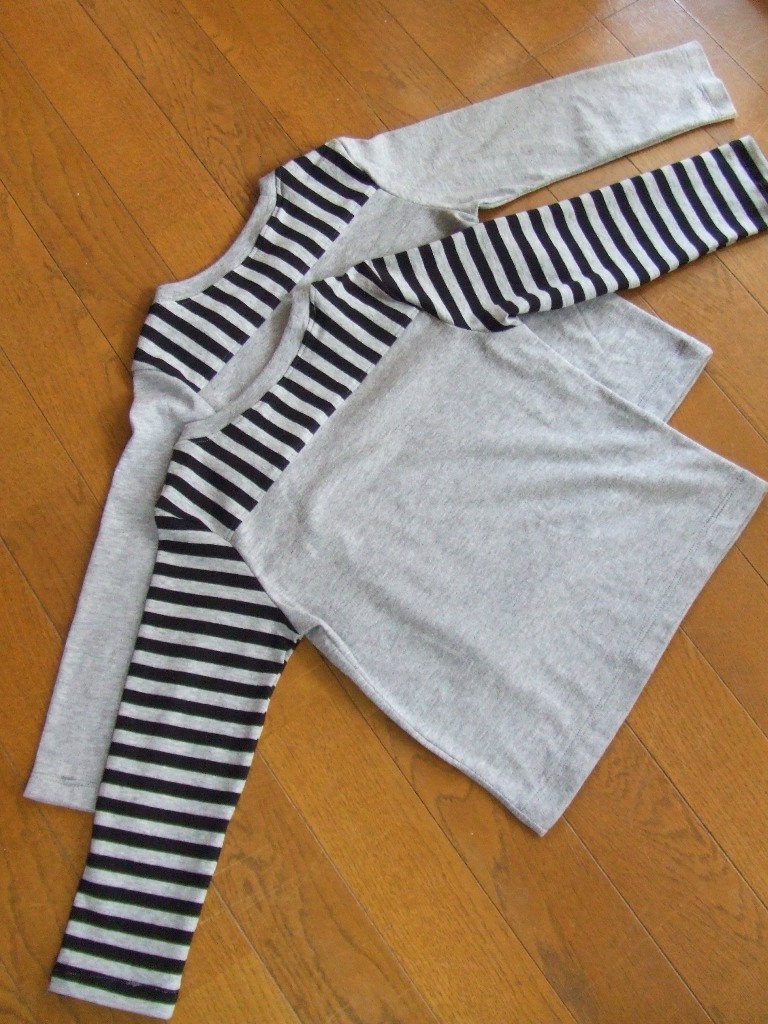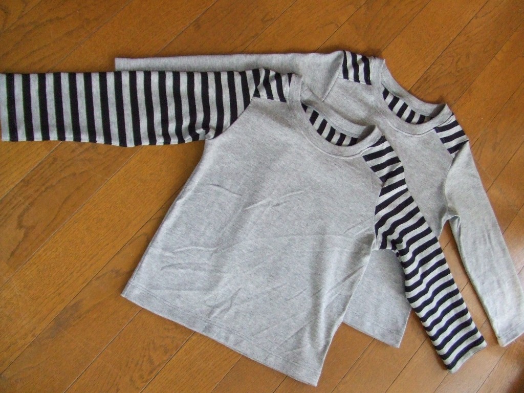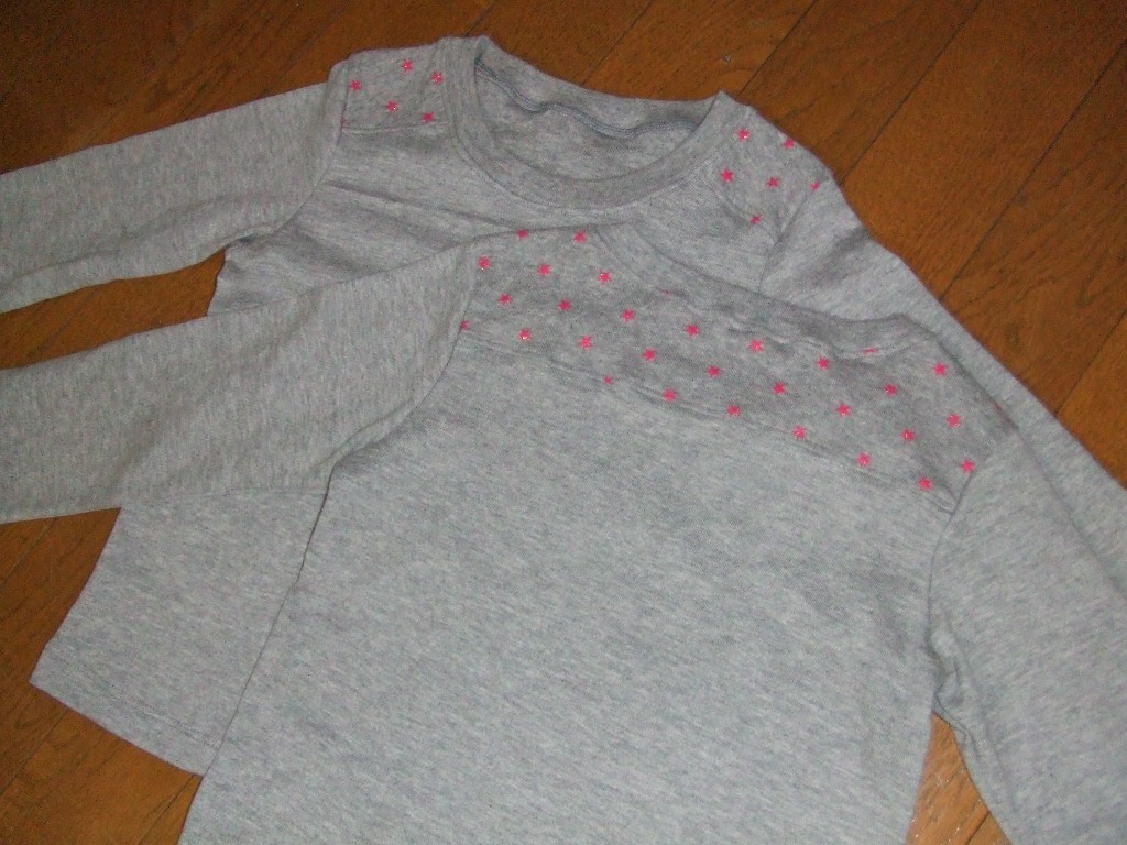 sanの大好きな☆柄で 長袖ショルダーヨークTシャツと半袖ヨークTシャツ 半袖の方は、前後ともギャザーが入っているので女の子らしくてかわいい感じ。 友達や近所のママ友からも、kouの出産祝いを色々いただいたので 内祝いと一緒に渡すために作りました。 七分袖のパジャマ。 長袖Tシャツ 半袖Tシャツ これは、sanとお揃いの☆柄で長袖Tシャツ 一枚は甥っ子へ。 もう一枚は同じ保育所に通う男の子へプレゼント。 お揃い大好きのsanは大喜びでした。